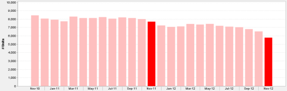 The inventory of listed Chicago houses for sale continues to drop. There were 5,790 houses for sale in Chicago in November down 24.8% from November 2011 when there were 7,697 houses for sale.*